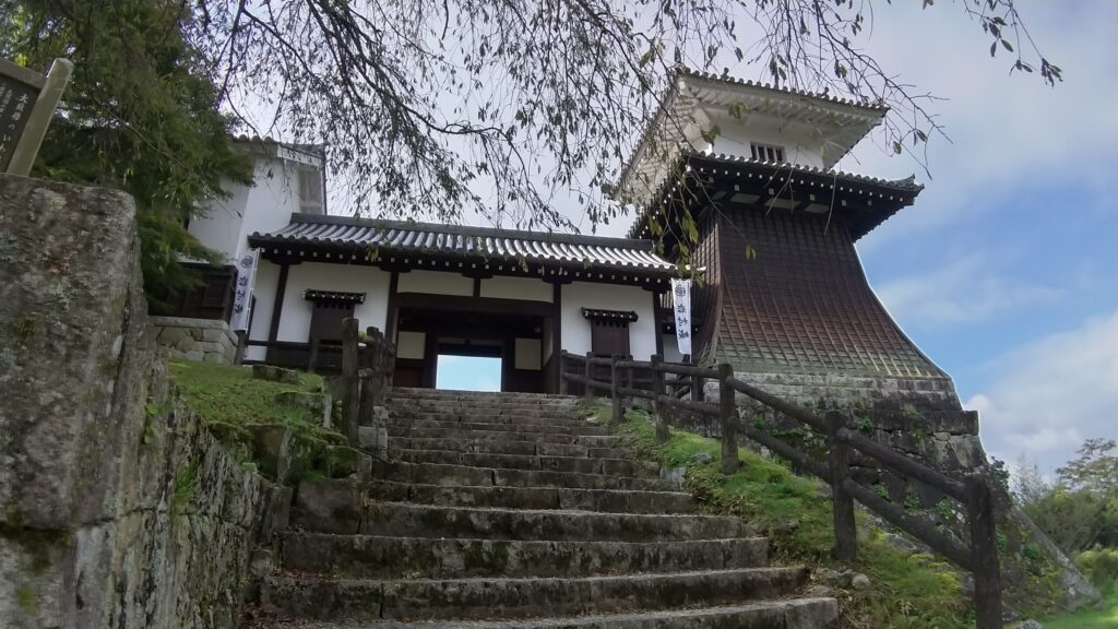 岩村城に着きました!復元された「表御門」と「太鼓櫓」が見える場所から撮影しました。