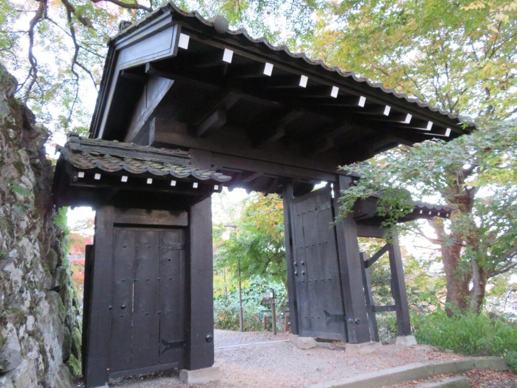 そして、南登り口へ降りると復元された「搦手門」がありました。