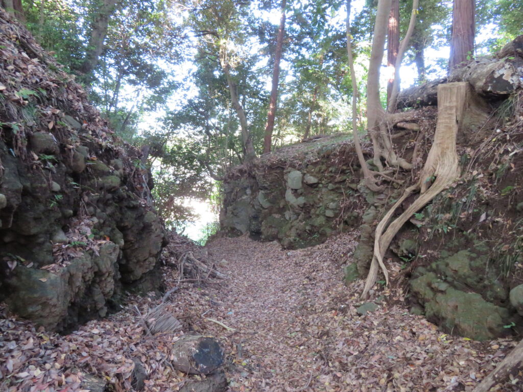 せっかく来たので「大空堀」の奥まで行ってみました。奥のほうは大きな岩があり、地盤が固い場所に城があったことが伺えます。